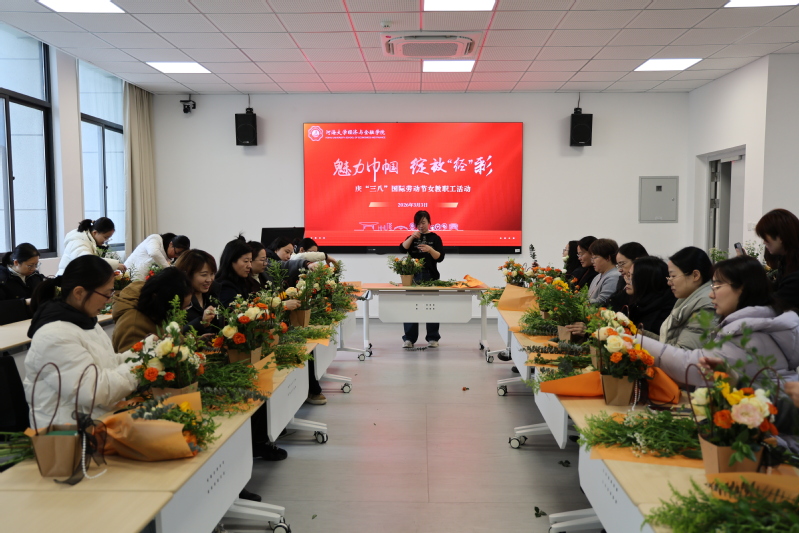 为庆祝2026年“三八”国际劳动妇女节,丰富女教职工精神文化生活,凝聚巾帼力量,增强学院向心力与凝聚力,3月3日,太阳成集团tyc33455cc工会在常州校区33号楼304室举办举办“魅力巾帼,绽放‘经’彩”庆“三八”国际劳动妇女节女教职工活动,全院教职工欢聚一堂,共赴这场与美好相伴的花艺之约,在指尖生花中感受生活之美,在交流互动中凝聚奋进力量。
